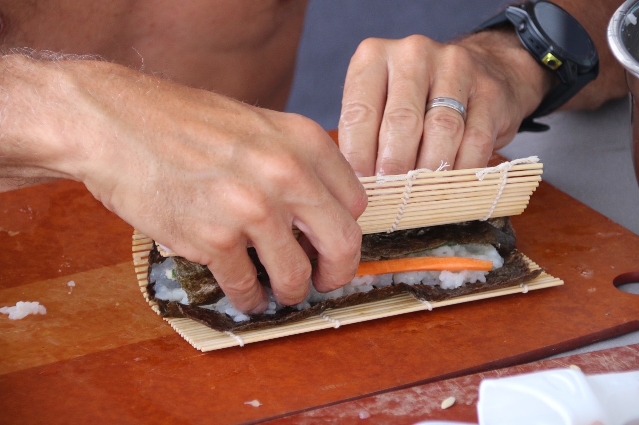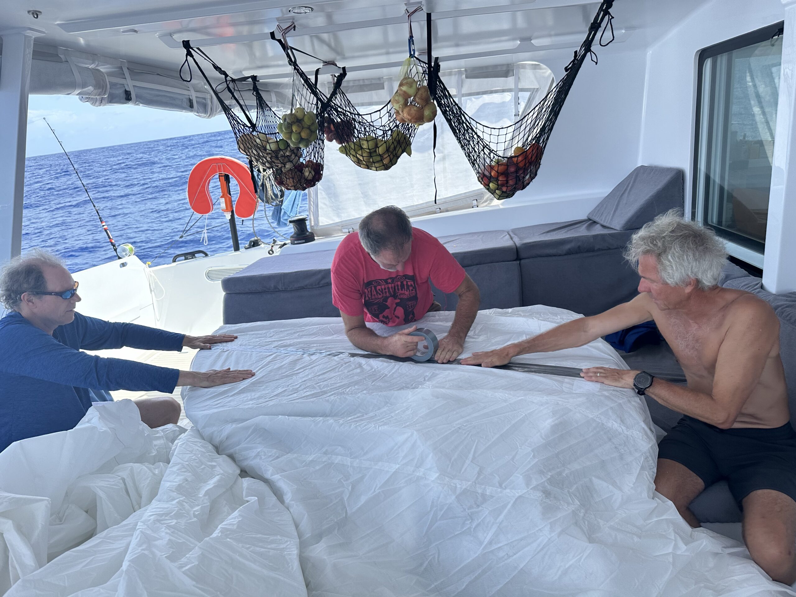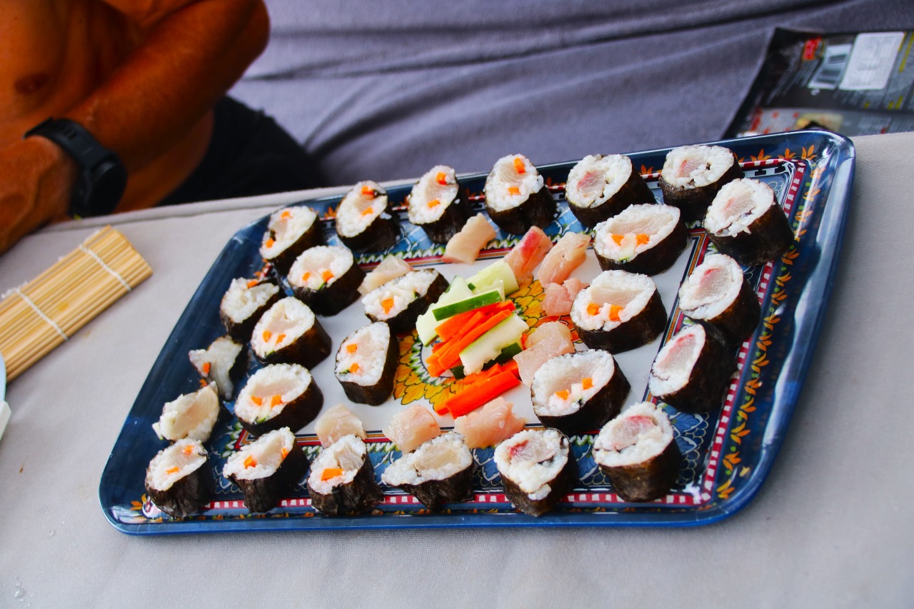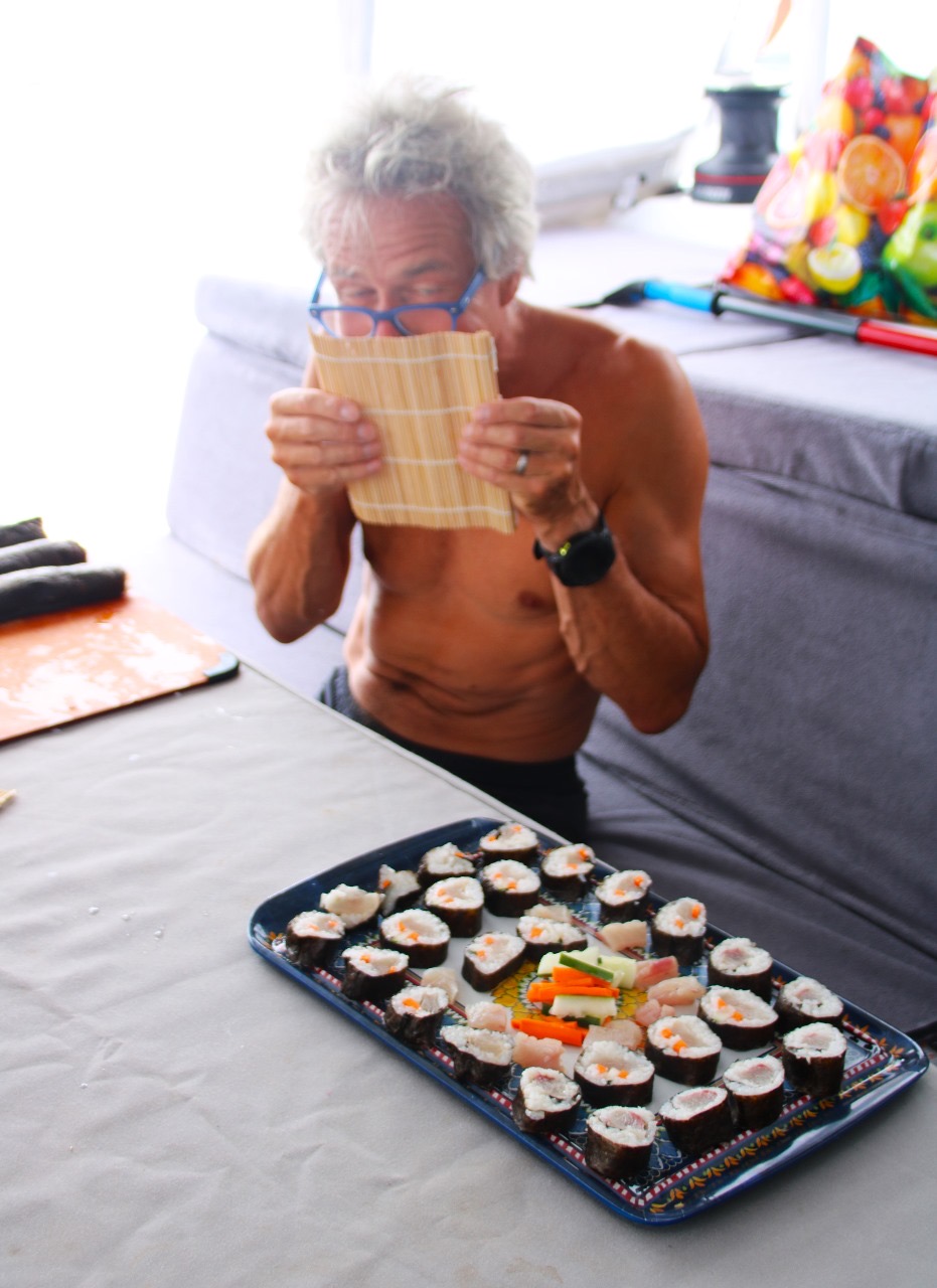 Under Sail Updates Equator swim, catching fish, making sushi, fixing … April 2, 2024 Fixing dinghy Evening Brown Noddy was our guest during the night Equator swim … … Ron catching Mahi Mahi … more of it Making Sushi rolls … … in detail … … finished. …. Fixing sail xwpkwimy